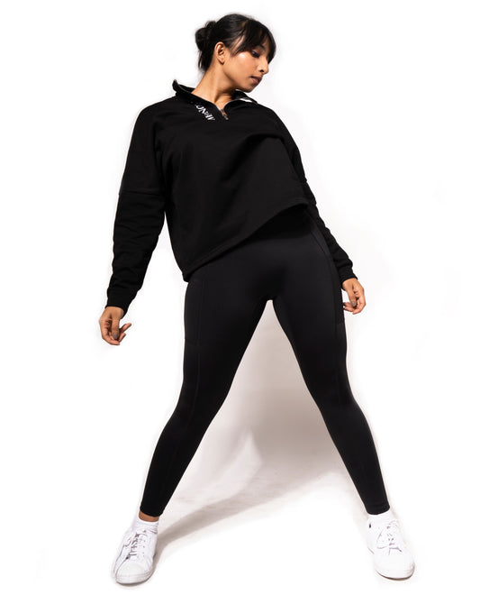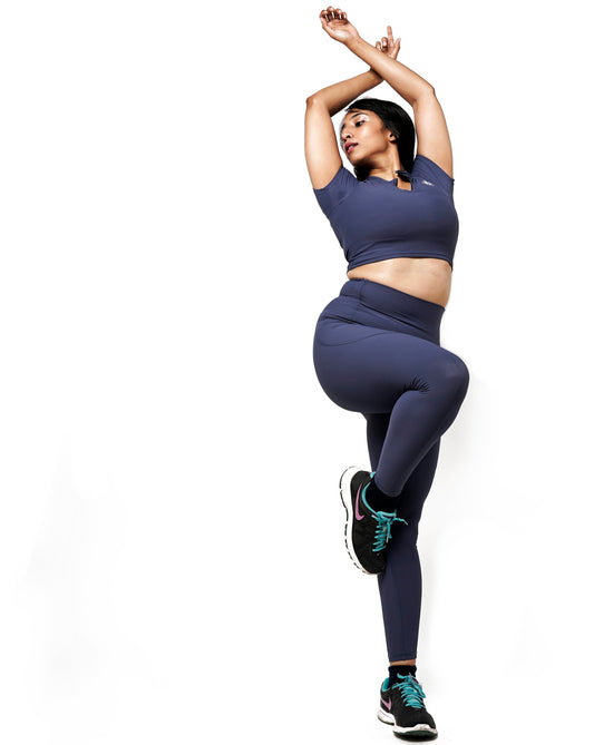 SHORT SLEEVE NECKLINE ZIPPER CROP TOP IN NAVY BLUE